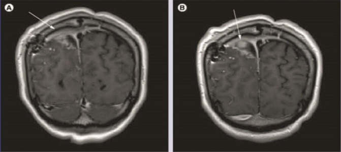 Gadobutrol (A & B) contrast - enhanced spin-echo T-weighted coronal brain images in a patient with brain tumor and postsurgical changes. shows dural enhancement ( A, arrow) at the right and left of the tumor with the presence of nodular area of enhancement ( B, arrow) (A & B) show a better degree of enhancement and internal morphology.